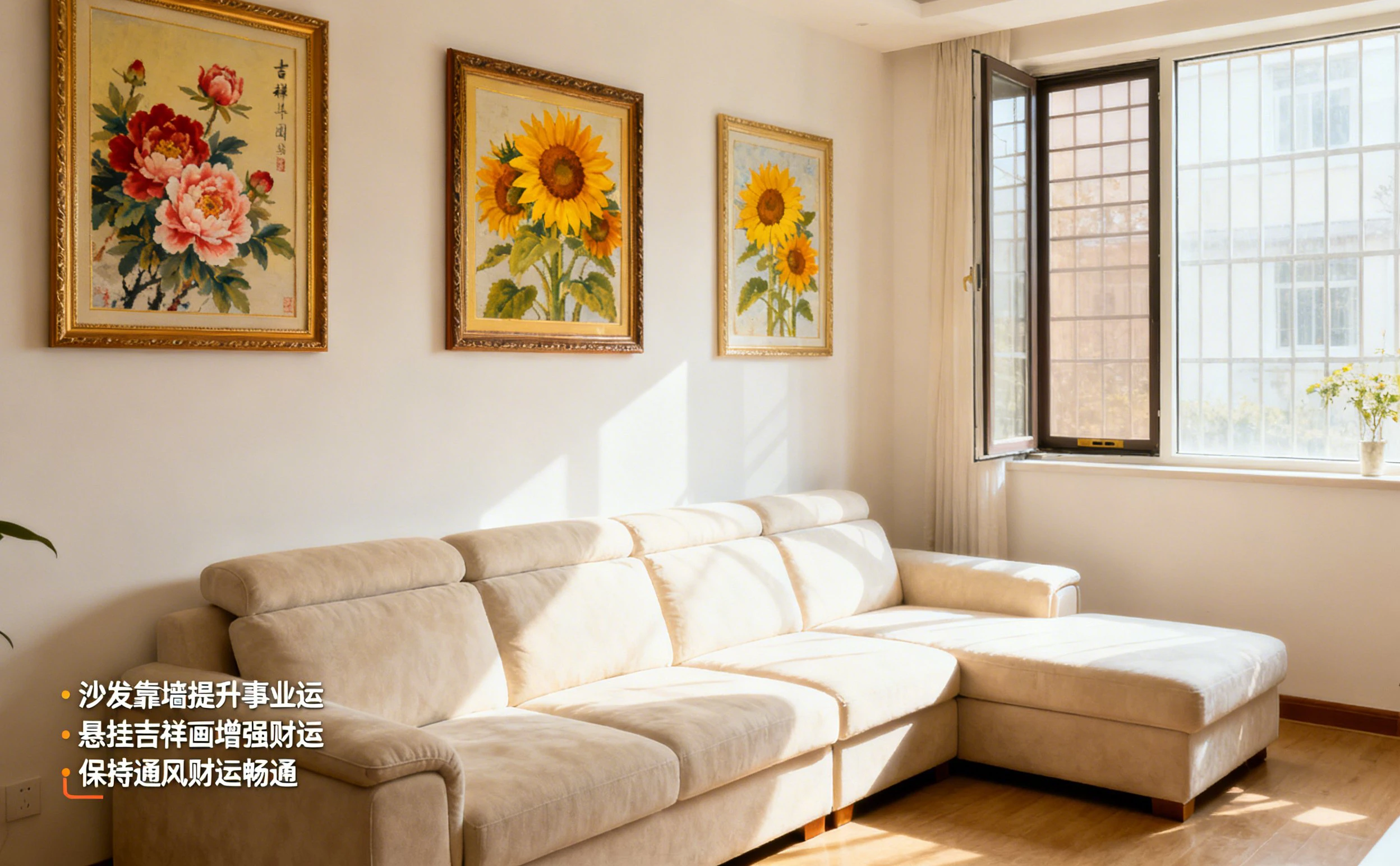 Display Auspicious Paintings: Images like peonies or sunflowers symbolize riches and honor, boosting wealth and attracting beneficial connections.