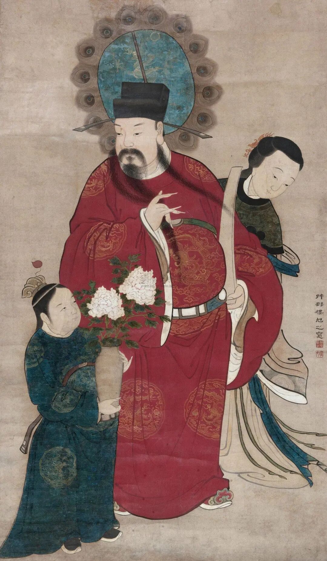 The Heavenly Official, together with the Earth Official and Water Official, are known as the "Three Official Emperors." They are respectively the Shangyuan Heavenly Official who bestows blessings, the Zhongyuan Earth Official who pardons sins, and the Xiayuan Water Official who relieves calamities. The Three Officials oversee merits and faults, helping both the living and the deceased. On each Shangyuan, Zhongyuan, and Xiayuan day, they tour the Three Realms to examine all beings.