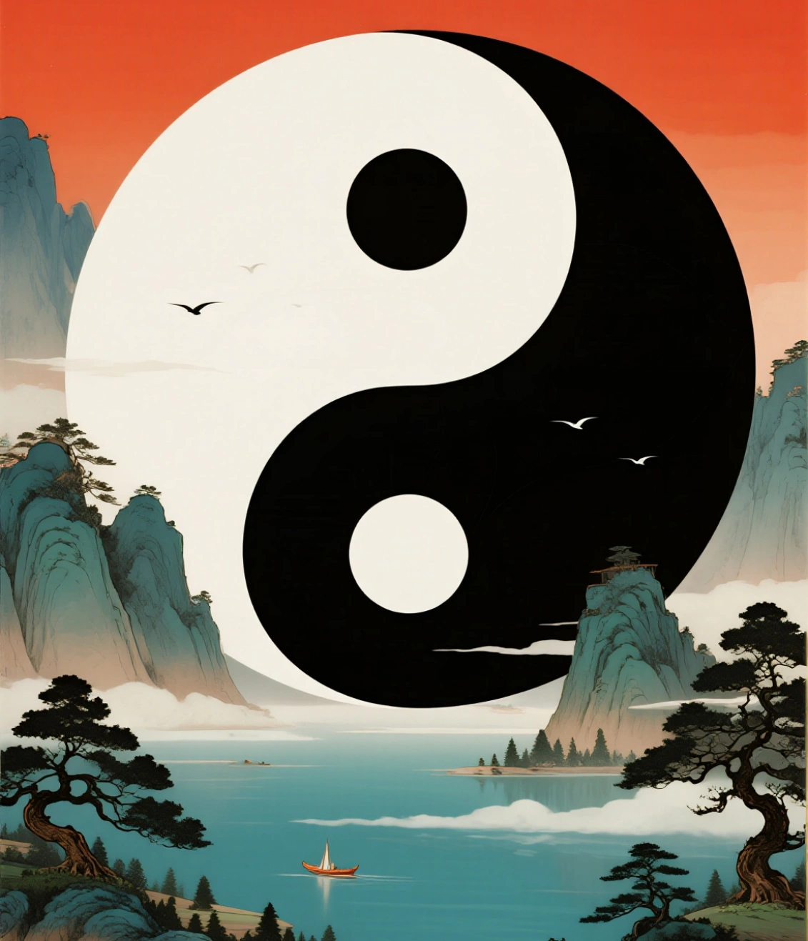 Interaction of Yin-Yang: The black-and-white Taiji symbol represents interdependence, constraint, and transformation—reflecting the universal law of unity in opposition.