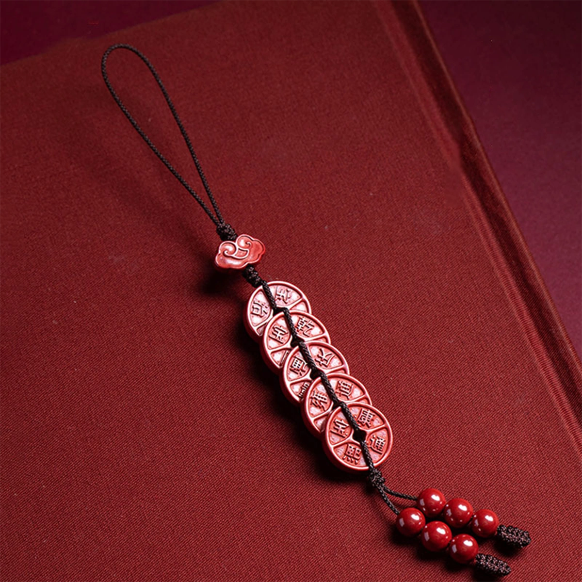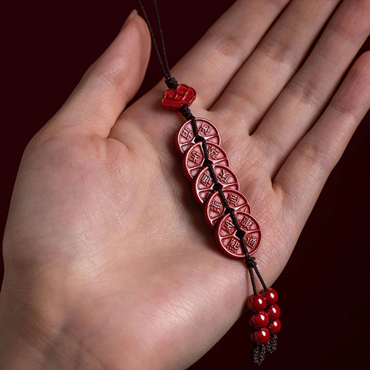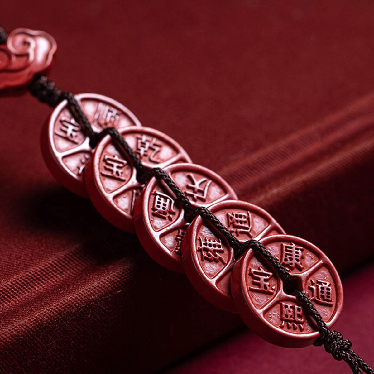 1. The Cinnabar & Five Emperor Coins Pendant is a composite protective talisman, threaded with five ancient coins from Shunzhi to Jiaqing (Qing Dynasty, DC 1636-1912 YEAR), with a cinnabar-engraved 'Imperial Decree to Suppress Evil' talisman plaque suspended at the center.