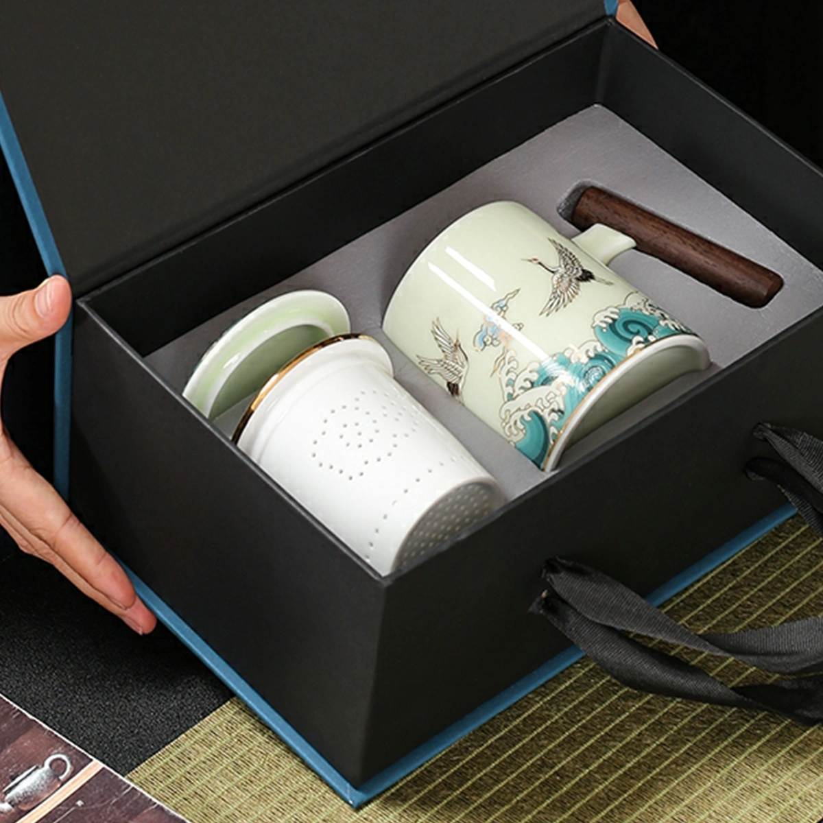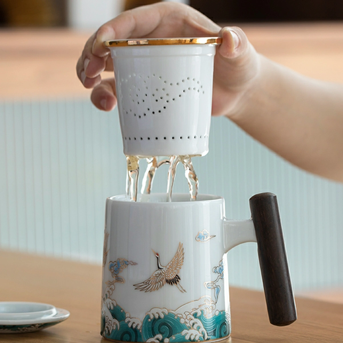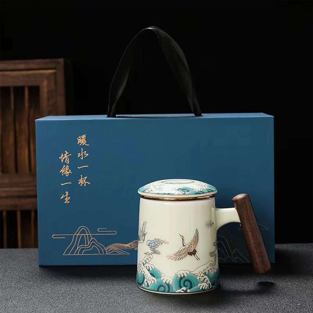 1. Auspicious Crane Tea Cup inherits the aesthetics of Emperor Huizong’s 《Auspicious Cranes》(《瑞鹤图》, 1112 AD), featuring celadon-glazed bone china with hand-painted cranes soaring through clouds.