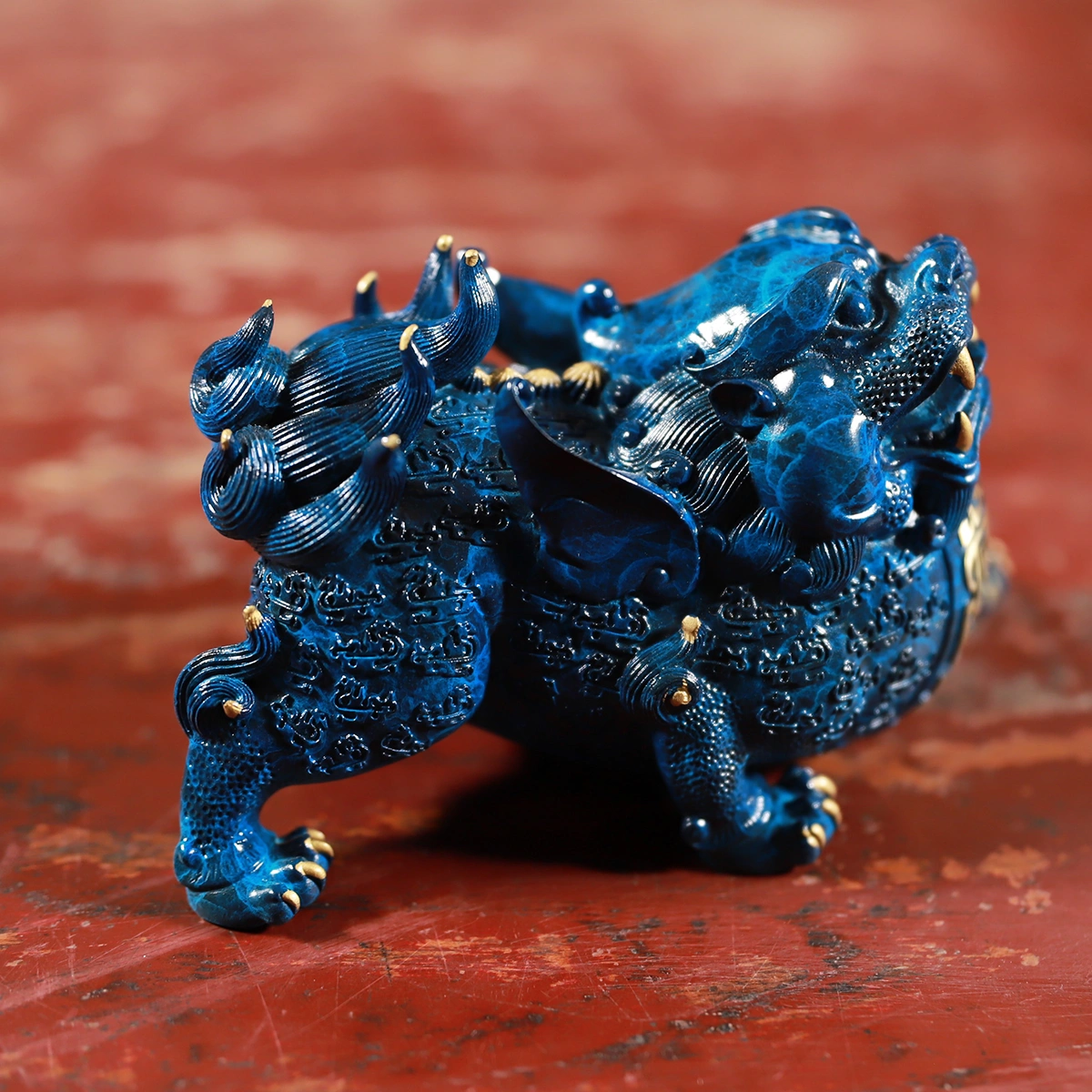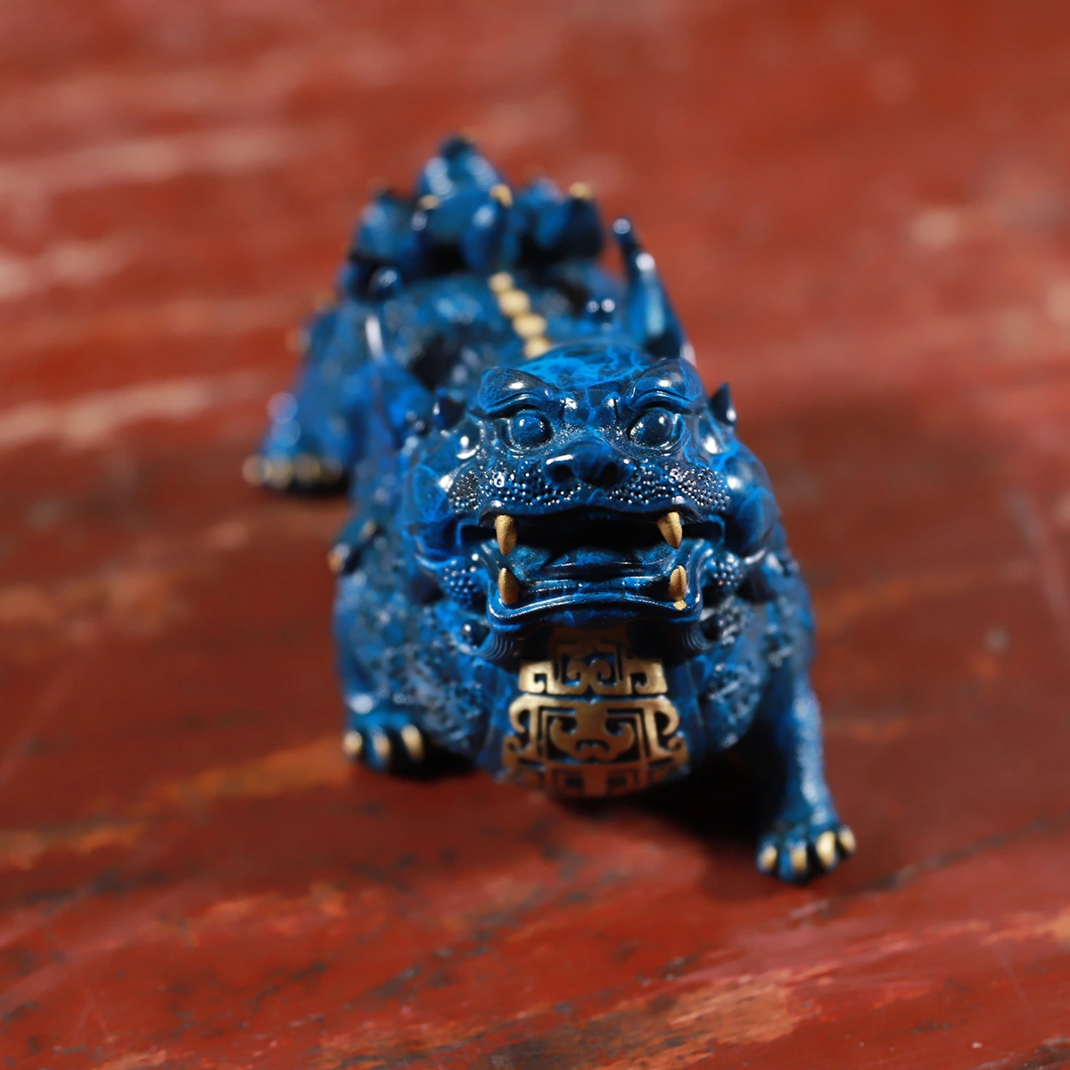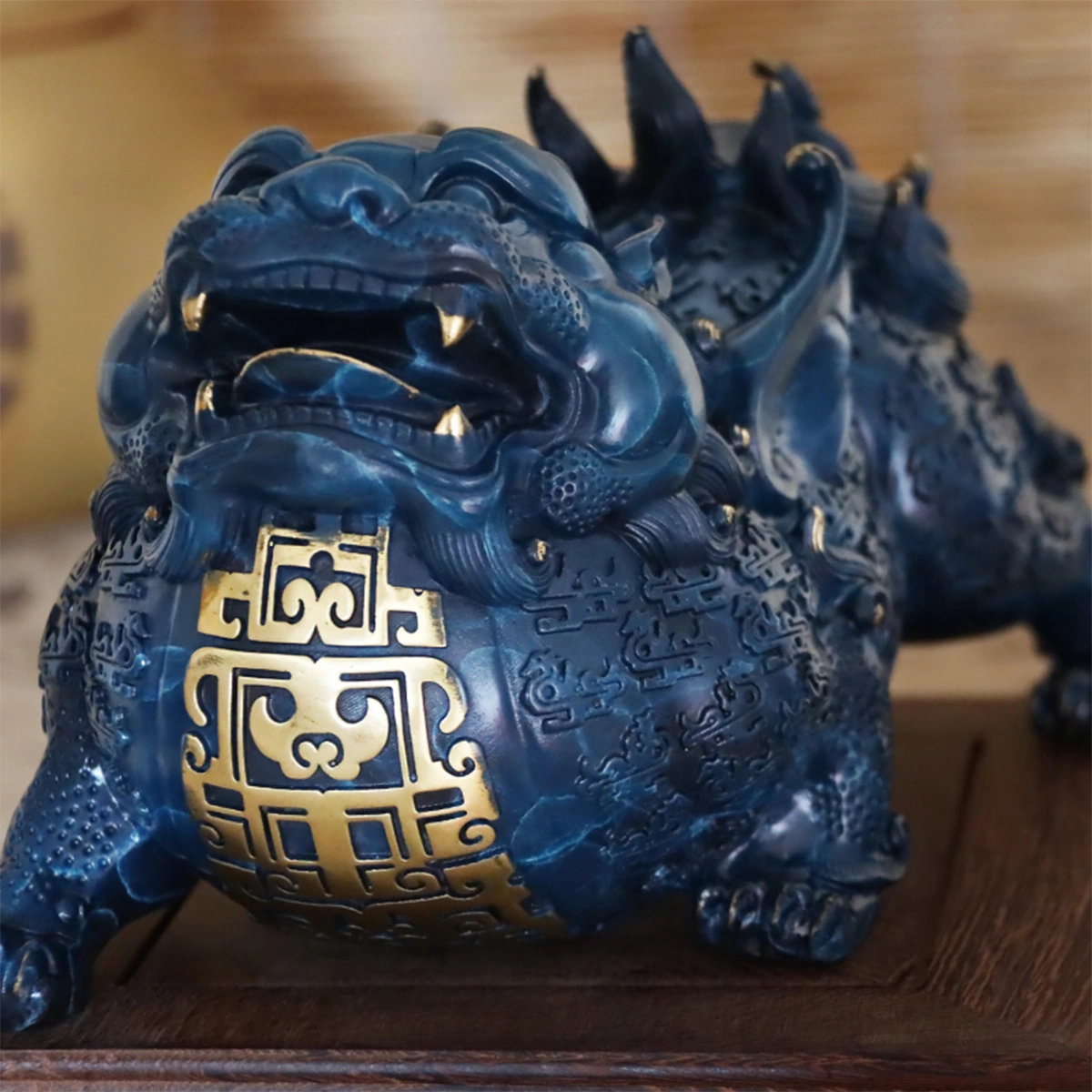 1. The Colored Pure Copper Pi Xiu Statue synthesizes Five-Element synergy into a wealth-sacred artifact. Cast in ancient-method pure copper with a majestic Pi Xiu form, its body glazed deep-sea blue and belly/armor gilded gold (蓝身金腹金甲).