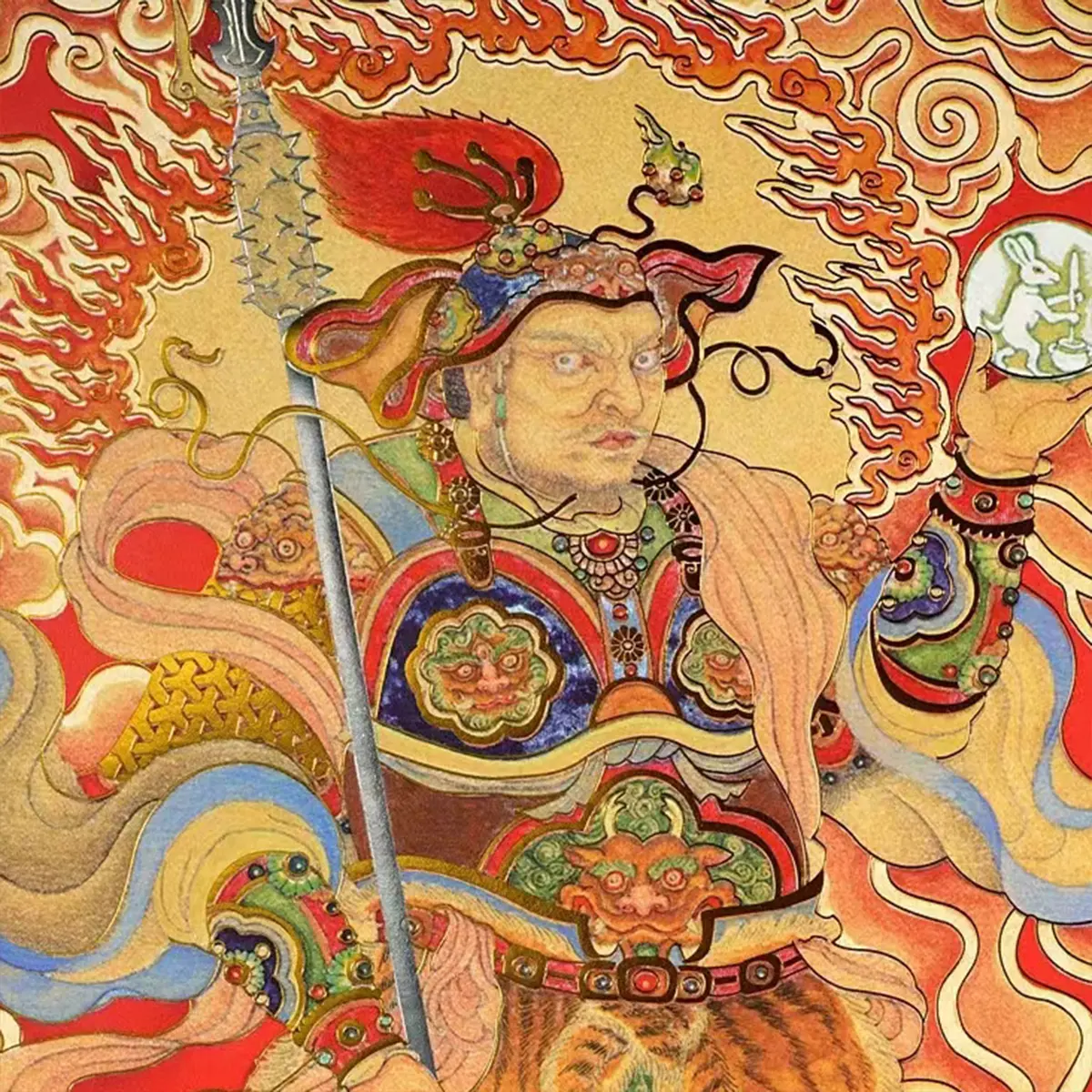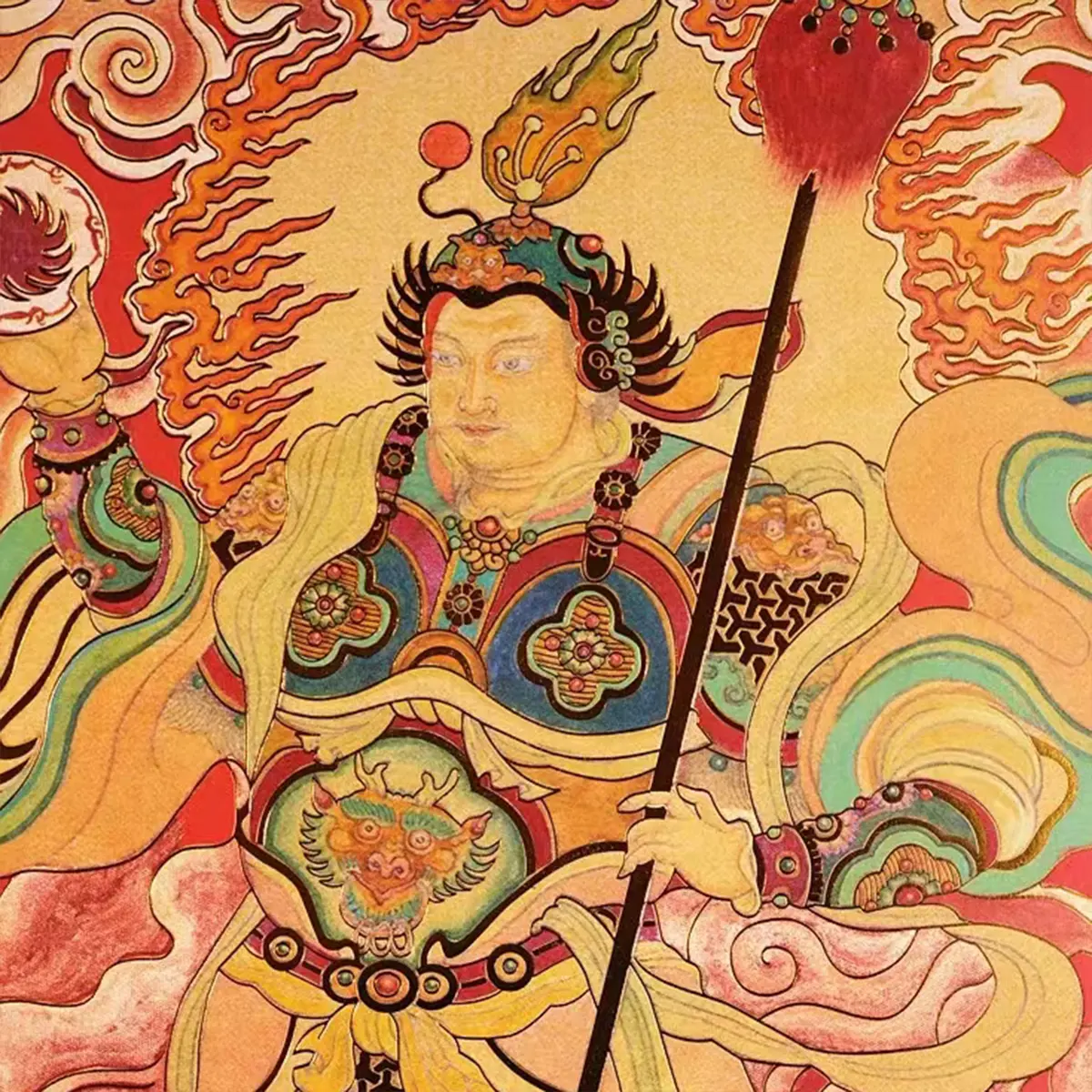 Yuchi Gong (Right Door God): Steel whip cracks the earth, warding off formless afflictions like nightmare oppression or land spirits (地基阴灵);