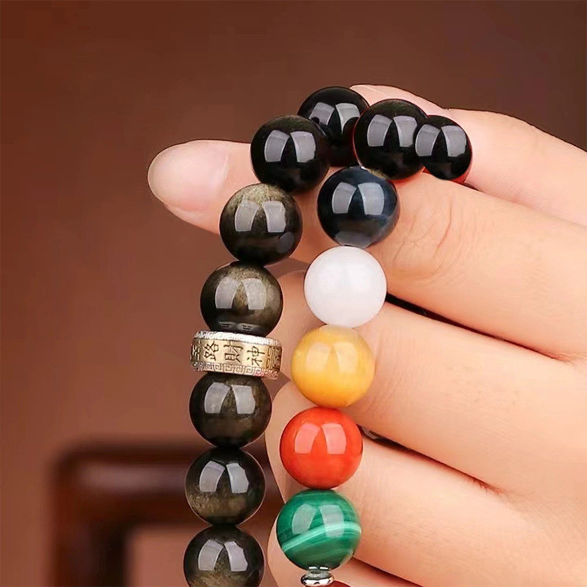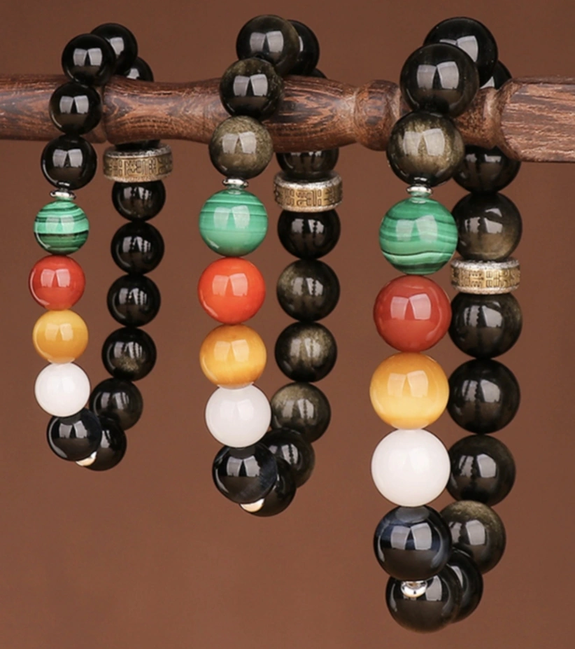 1. The Five Roads Wealth Deities Five-Colored Gemstone Bracelet converges cosmic wealth energies, crafted with lapis lazuli, malachite, citrine, red agate, and white conch beads, interlaced with gilded deity plaques.