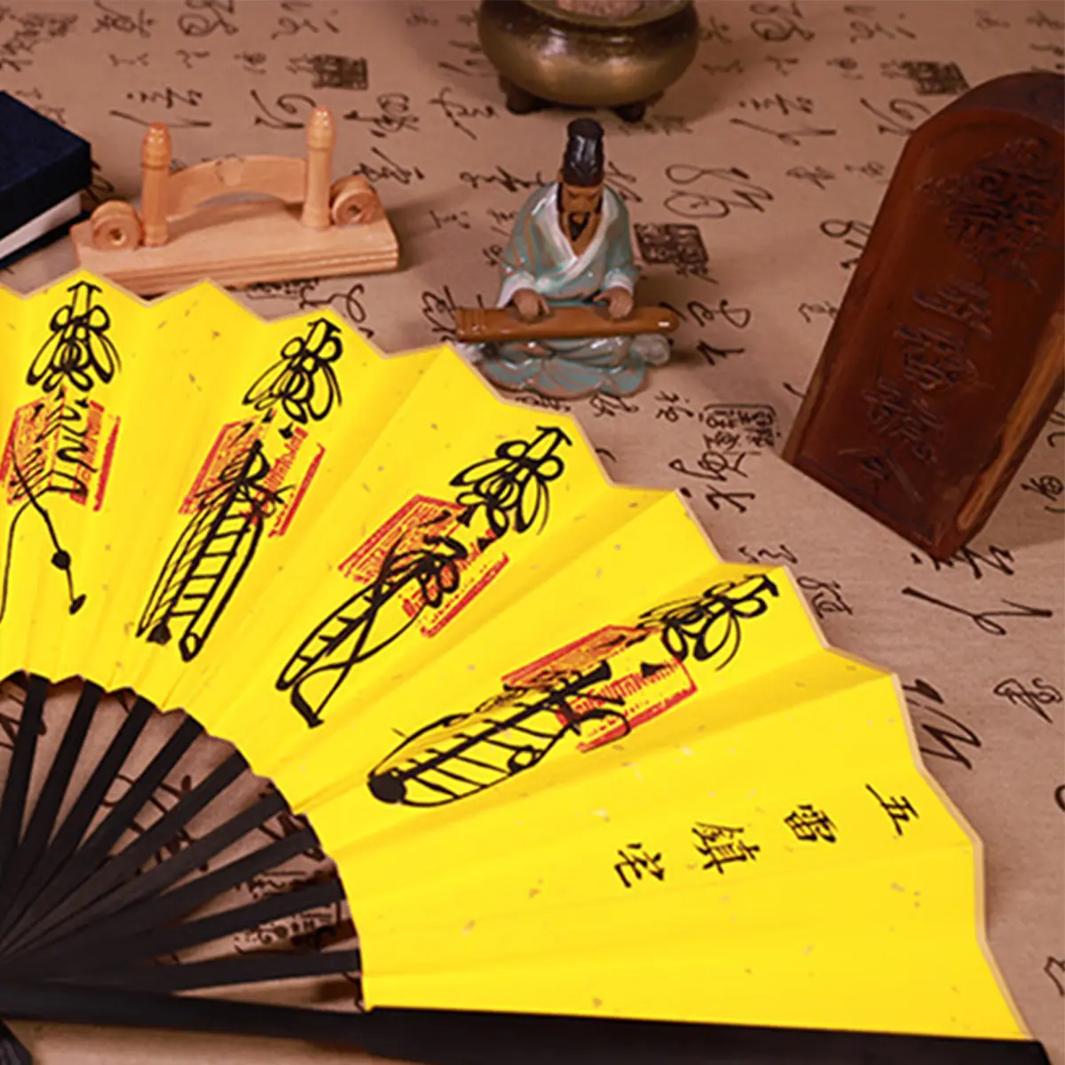1. This hand-painted fan, crafted with touqing ebony bamboo ribs, embodies the essence of tranquility through powder-pigment talismanic art.