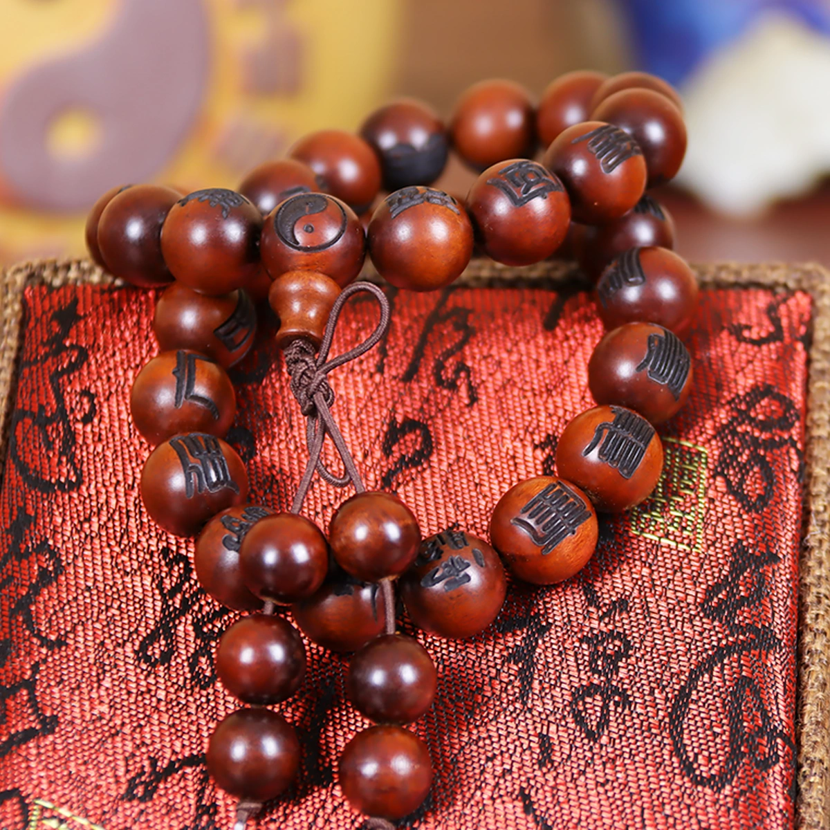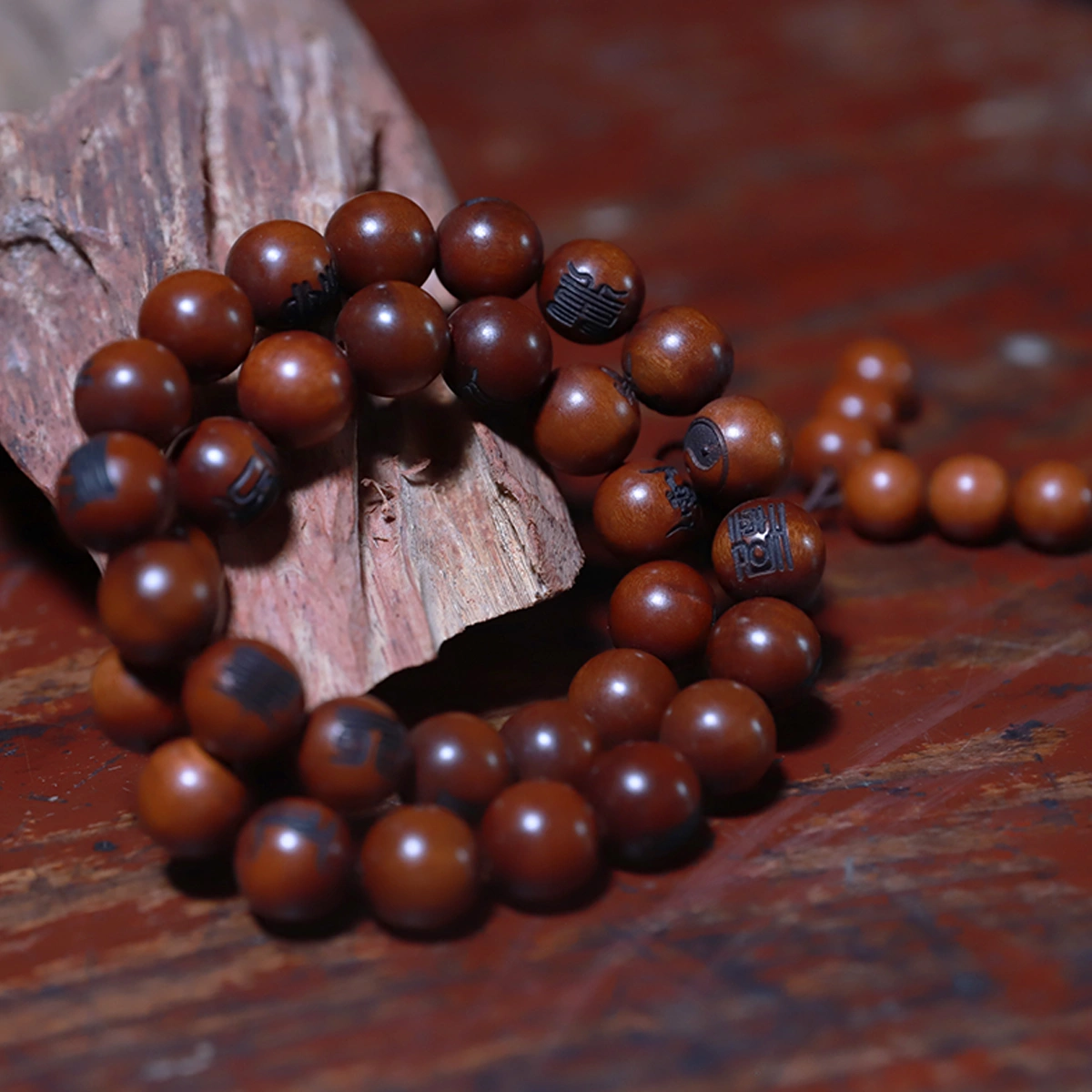 1. Each wood bead bears engraved constellation names (角 Jiao, 亢 Kang, 氐 Di, 房 Fang, etc.) and corresponding sacred beasts.