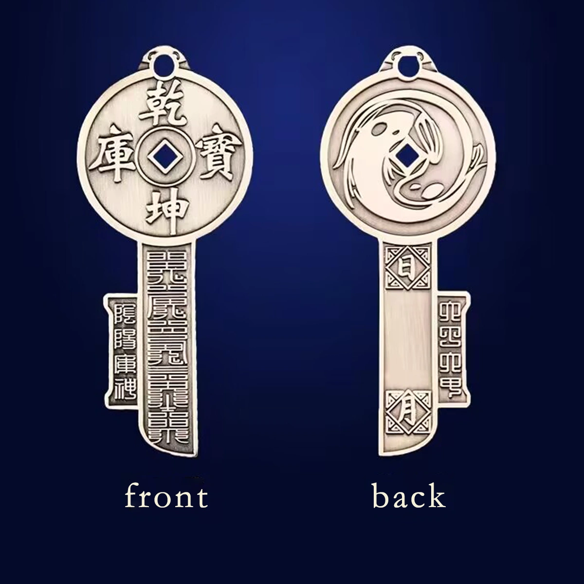 1. The Pure Copper Qian-Kun Treasure Vault Key Pendan is a spiritual token that opens the secret treasure house of wealth. It is cast in antique brass into a giant key shape, with relief carvings of the Five Gods of Wealth and the "Wealth and Treasure" mantra on the surface.