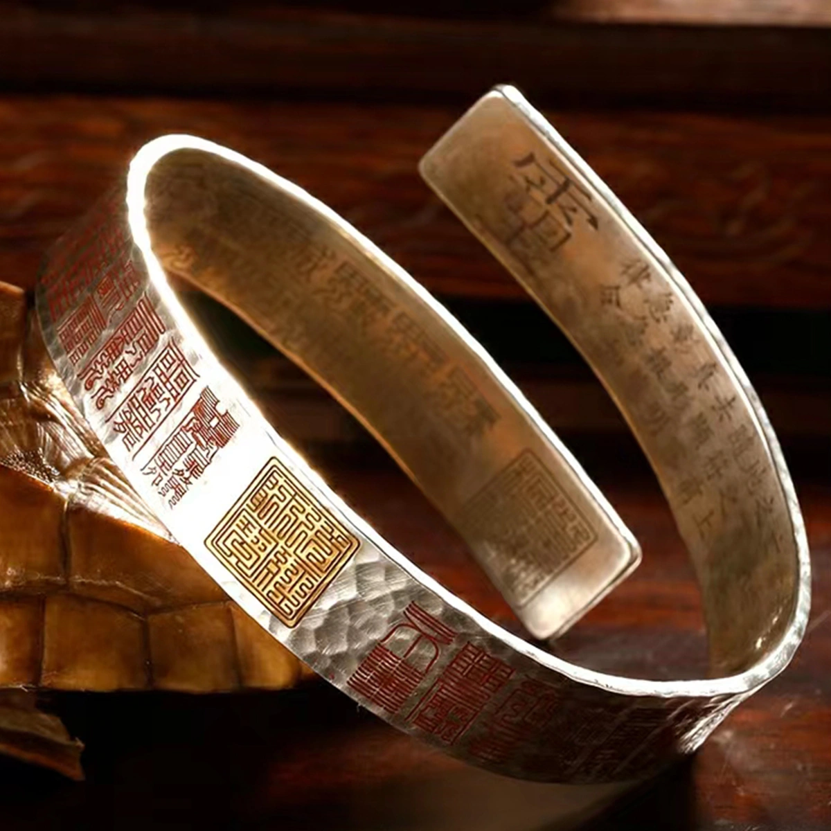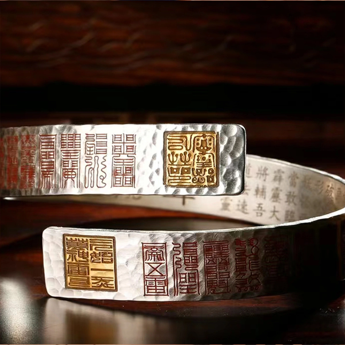 1. The Pure Silver Blessing Script Bangle is a piece of jewelry that carries millennia of wisdom, inlaid with meticulously engraved Cloud Seal inscriptions.