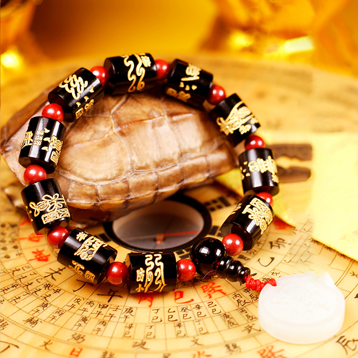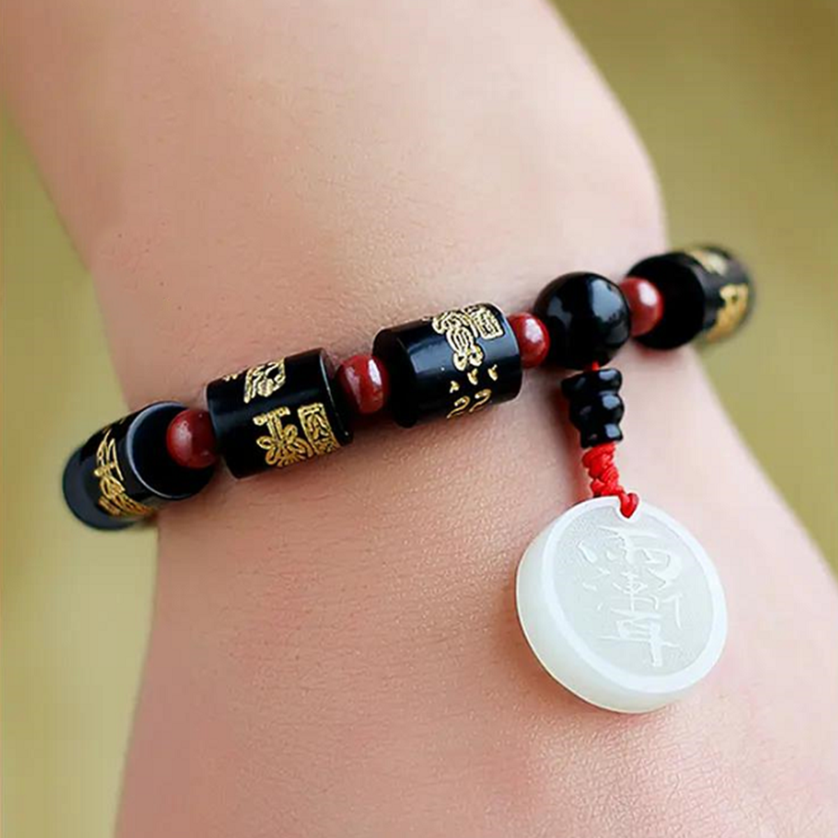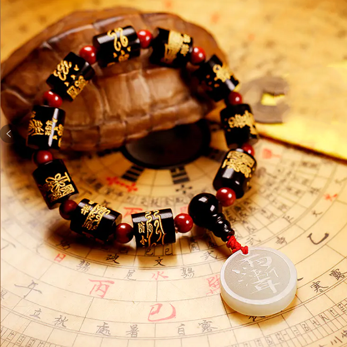 1. Wuxing Black Jade Bracelet is an energy-charged artifact that harmonizes celestial and terrestrial Qi. Meticulously carved from ink jade, it features beads inscribed with the symbols of Metal, Wood, Water, Fire, and Earth.